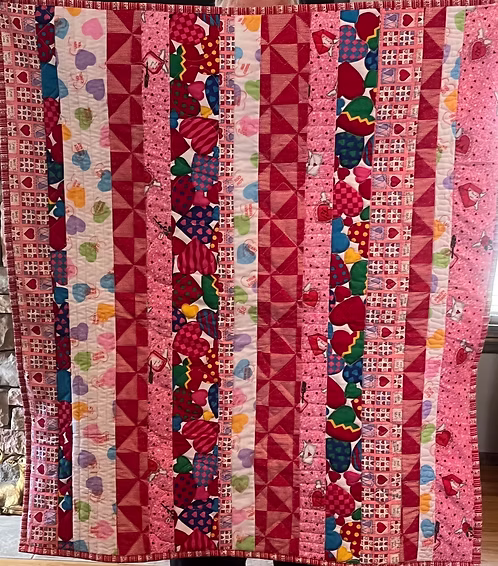 This cute baby quilt is perfect for a baby born in February or any month. This quilt measures 35″ X 40″ and consists of 5 fabrics representing Valentines Day.