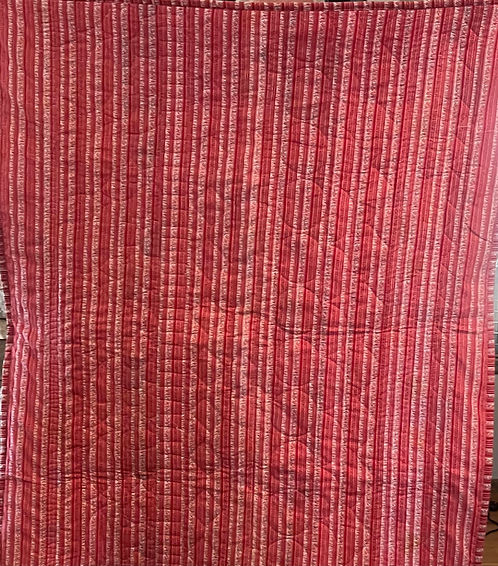 This cute baby quilt is perfect for a baby born in February or any month. This quilt measures 35″ X 40″ and consists of 5 fabrics representing Valentines Day. The backing is a multi-print red stripe. Front and back of this quilt is cotton, and the batting is polyester. The binding on this quilt is the same as the back.