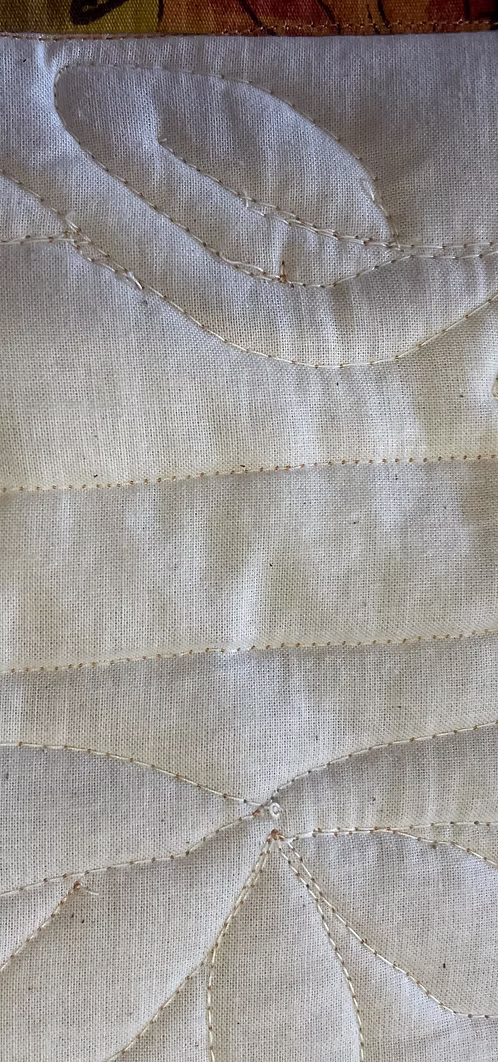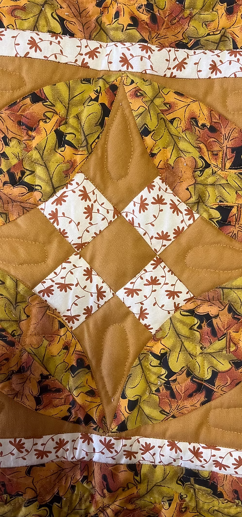 This 45″ X 20″ fall themed table runner can also be used as a wall hanging. There is a rod pocket on the back for hanging.There are three 12″ circles, with 5 squares in the center. Fall multi colored leaves is the main fabric in this quilt. A tan/butterscotch color fills in the background. Two borders are in this quilt. An inner 1″ border is white with tan designs and an outer 3″ border with the leaves fabric. The back is white with multiple quilting designs. These designs can be better seen from the back.All fabric and batting is cotton.
