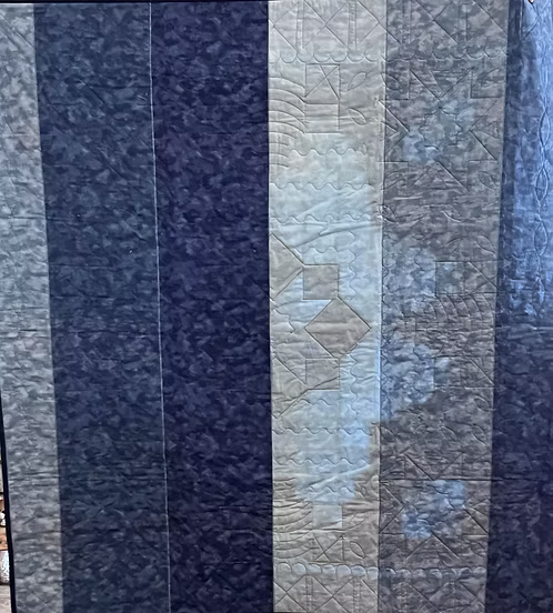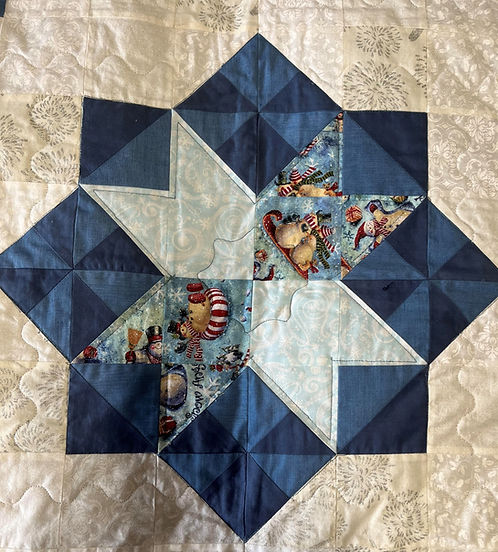 This Snowman Quilt is the perfect throw for winter time.  Its size is 54” X 60”.and is all cotton. (front, back, and batting)This throw features two snowmen on each side and a star in each corner with active snowmen in the small squares.  There is a large star in the center featuring pinwheels in the four corners.  The active snowmen in the outside corners are on sparkley fabric.  Poinsettia fabric make up the snowmen’s hats.Echo quilting is done in the triangles.  The snowmen are quilted with wavey lines and curved lines between them. The 1” white border is quilted in clamshells.  The 4 ½” outside border is peppermint candy fabric.  The binding is ½” dark blue.The back of this throw is mulit shades of blue.This throw is machines pieced and machine quilted.